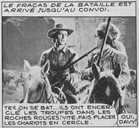 Illustration traditionnelle du personnage de Davy Crockett. Le traitement peut être rapproché du Kit Carson, de dix ans antérieur, de George B. Seitz publié dans Far West Magazine du même éditeur.
