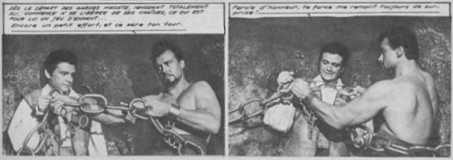A gauche, Jackie Lane dans son cachot. A droite, Lex Barker et les pirates qui se joignent à lui.